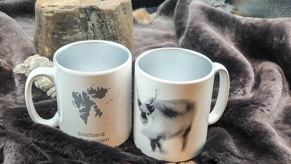 White ceramic mugs with a bright silver coloured inside. Each mug features a photo of one of Svalbards wildlife and a map of Svalbard. Each photo and the map is a delicate grey colour, to coplement the silver inner colour of the mug. The result is a truly sophisticated and wonderful mug.